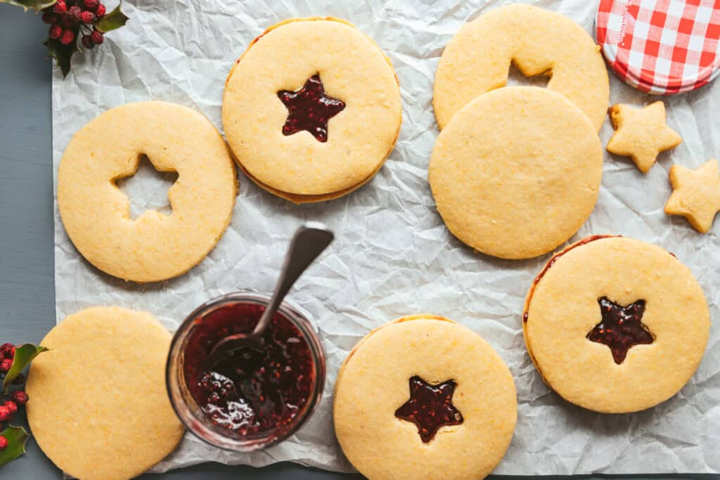 - Once cool, spoon about 1-2 tablespoons of jam onto each solid cookie. Gently press a cut-out cookie on top to make a sandwich. If the jam squishes out a little, congratulations – that’s the charm of a Linzer.