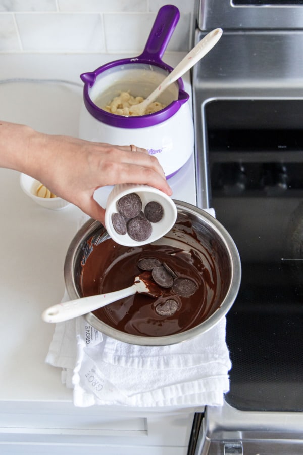 Next it’s time to melt and temper the chocolates. Ideally, the white chocolate will be ready about 5-10 minutes after the dark chocolate, so plan your setup accordingly. It helps to have an extra set of hands to stir and keep an eye on temperatures.