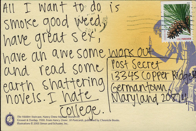 Dear Kathy – I sent in a secret saying that I was going to kill myself in the next couple of days after writing it. Then a day or 2 after mailing it, I couldn’t get the thought out of my head that a mail carrier would read my postcard and not want me to die, even though they didn’t know me.