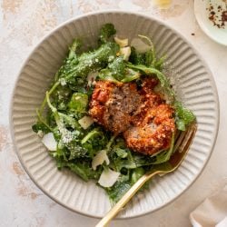 Top the salad with your (warm or cold) meatballs (whole or chopped!) and sprinkle with the finely grated parm. Serve!