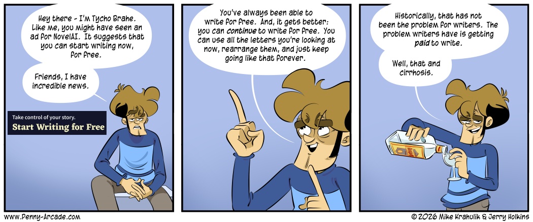 Looking at the text he sent me, I think the slice of the ad in the first panel is directly clipped from it. As a dedicated Redditor, they tried and failed to reach him with this because he abhors the written word. Well, he likes to read them I guess but he doesn’t like to write them. Which you’d think would make the product a good fit! Poor bastards. I could have told them: he’s impossible to work with.